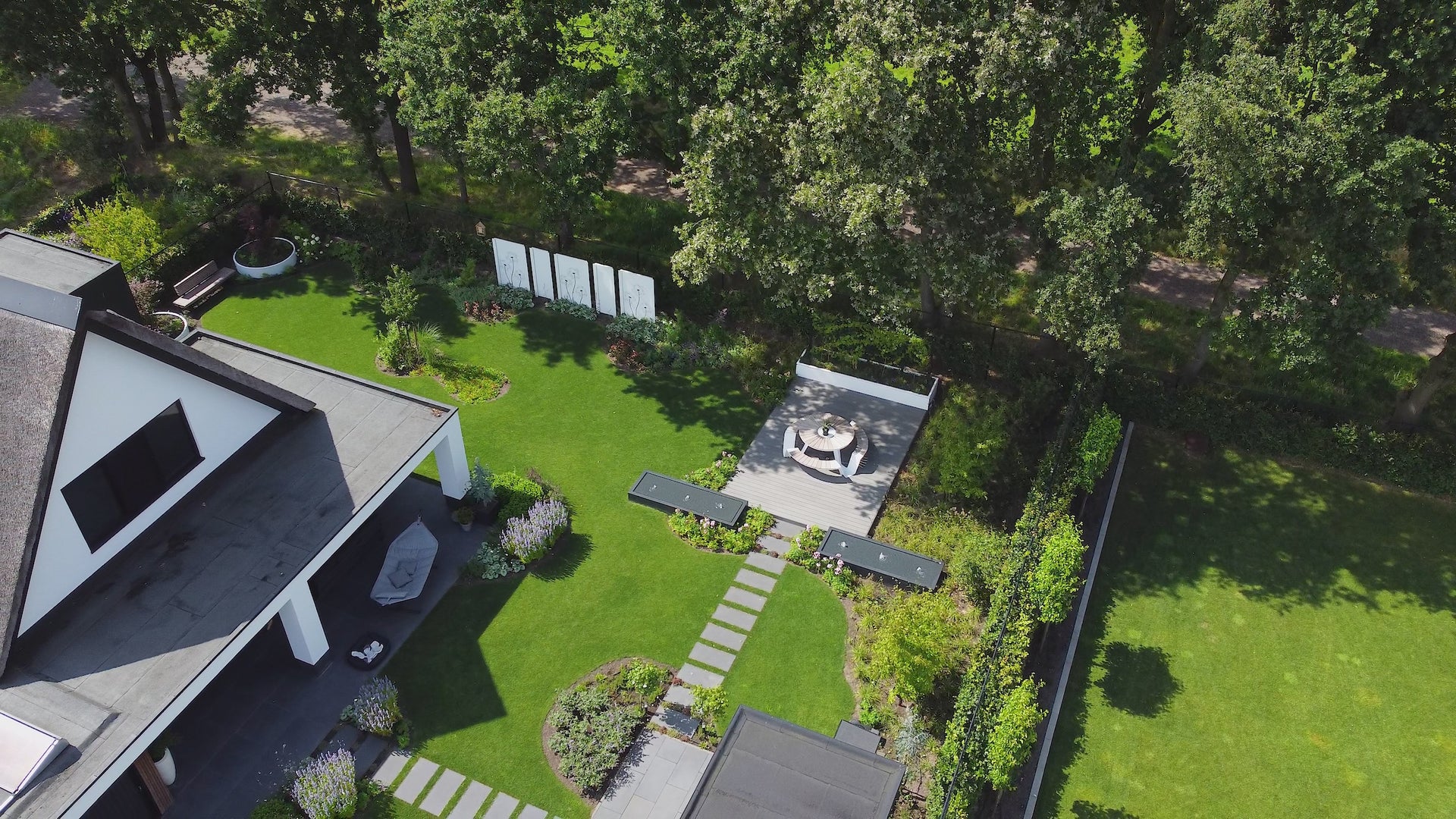 Den öppna konstruktionen – helt utan tak – gör pergolan till ett subtilt men kraftfullt designelement. Den kan användas för att rama in ytor, skapa rum i trädgården eller som bas för framtida komplettering med exempelvis växter eller belysning.